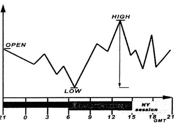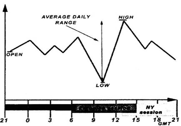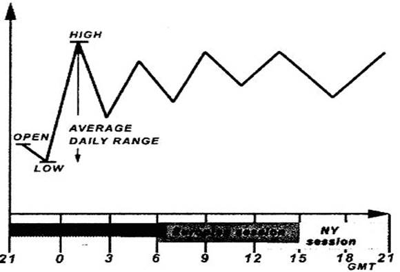 Есть еще большое число других циклов рыночной активности, но все эти варианты невозможно описать. Поскольку можно идентифицировать данные циклы, трейдер имеет намного более точную оценку вероятности рыночного движения в течение следующего периода времени в одном или другом направлении, что позволяет разумно планировать время торговли. Когда трейдер обнаруживает эту регулярность, она позволяет ему менять график присутствия на рынке, избегая периодов пониженной активности, и участвовать в высоких колебаниях амплитуды. Некоторые циклические законы даже позволяют торговать автоматически, помещая предварительные остановки и лимиты на некоторых установленных ценовых уровнях. К сожалению, невозможно предсказать конец одного цикла и начало нового, а также изменения в рыночном поведении. Может быть много разновидностей циклов, но одна или несколько отличительных особенностей могут характеризовать всех из них типично. Есть общие периоды увеличенной и уменьшенной активности, и некоторого подобия в последовательности внутридневных колебаний в течение всех циклов. Такие же циклы формируются в течение от нескольких недель до нескольких месяцев, и трейдер почти всегда имеет достаточно времени не только, чтобы идентифицировать изменения в характере рыночного поведения, но также и использовать их в полной мере для получения максимальной прибыли. Я хочу достигнуть оптимального торгового результата, выбирая соответствующие шаблоны торговли из стандартного набора и подстраивая их к текущей ситуации. Регулирование обычно происходит в момент открытия новой позиции и выбора масштаба времени в течение одного торгового дня. В течение практического изучения на реальном рынке, мы будем иметь возможность видеть, как это работает.