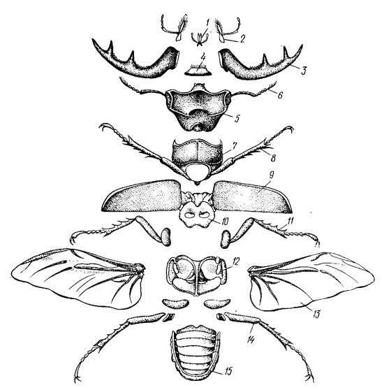 Назовите основные отличительные черты организации ракообразных, показывающих их эволюционный прогресс по сравнению с кольчатыми червями. В чем сходства и отличия строения речного рака и дафнии? Чем отличаются по строению паук и клещ? Назовите сходства и различия строения паукообразных и ракообразных. Задания для самостоятельной работы Выпишите в тетрадь болезни, вызываемые клещами. Укажите пути заражения и меры профилактики этих заболеваний. Для работы используйте электронные ресурсы и учебную литературу. Выпишите в тетрадь три представителя ракообразных и два представителя паукообразных из Красной книги ЧР и три представителя ракообразных из Красной книги РФ. Укажите их места обитания, причины сокращения численности и пути восстановления численности. Отметьте, входят ли эти животные в красный список Международного союза охраны природы (МСОП). Для работы используйте сеть Интернет, электронные версии и оригиналы Красной книги ЧР и Красной книги РФ. Цель: рассмотреть особенности внешнего строения насекомых Задания Задание 1. Изучите строение жука-оленя (рис. 12). Обратите внимание на разделение тела на отделы, расчлененность отделов, ротовые органы.