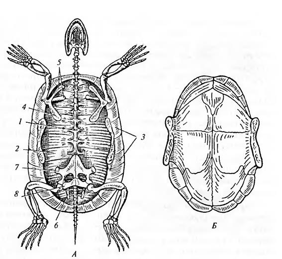 Задание 2. С помощью рис. 27 рассмотрите скелет черепахи. Обратите внимание на названия двух частей панциря, на то, что пояса конечностей сместились под ребра.