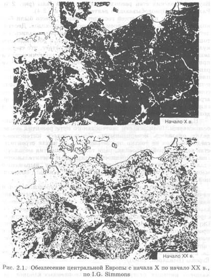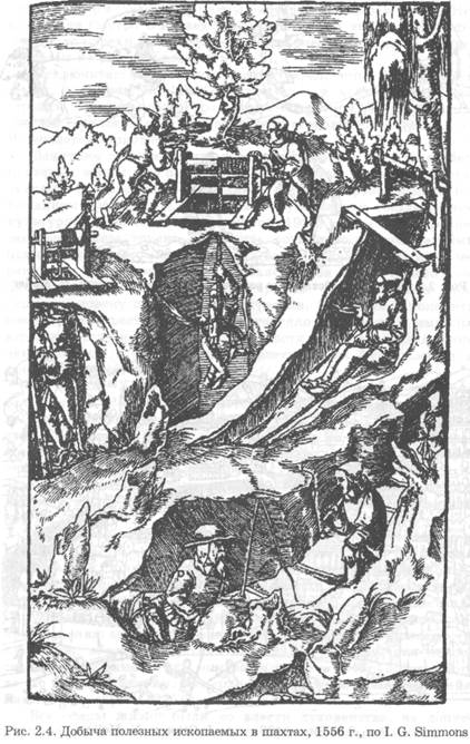 Территории за пределами благодатного Средиземноморья отличались более суровым климатом и были покрыты девственными дремучими лесами. Племена варваров жили в основном охотой и грабежами. Сельскохозяйственное производство было в зачаточном состоянии. Постепенно к началу XI в. на народы, населяющие Западную Европу, распространяется влияние римско-католической церкви; утверждается феодальный строй. В XI-XIII вв. происходит массовое сведение лесов в интересах земледелия (рис. 2.1). Это была эпоха "великого корчевания", по формулировке западных авторов (Бондарев, 1996). Новые земли быстро осваиваются под пахотные угодья. Двуполье заменяется трехпольем. Урожаи по сравнению с ранним средневековьем возрастают вдвое (рис. 2.2). Исключительно активно строятся укрепленные замки, монастыри, а вокруг них возникают жилые и хозяйственные постройки. Средневековые города долго сохраняли сельский облик. Внутри городских стен располагались огороды, сады (рис. 2.3). Развивается горнодобывающая деятельность (рис. 2.4).