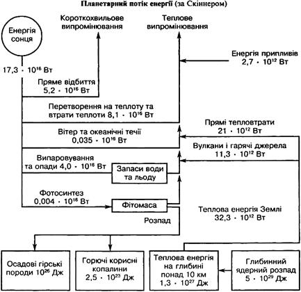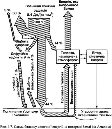Єдиним джерелом енергії, яка підтримує життя в біосфері нашої планети, є сонячна радіація. Чим більше надходить на Землю сонячної енергії, тим інтенсивніший перебіг життєвих процесів за сталості інших екологічних факторів. Близько 99 % сонячної енергії припадає на випромінювання з довжиною хвиль 0,2-4 мкм. Майже половина цієї енергії-це хвилі видимого спектра (0,38-0,77 мкм), друга частина – хвилі ультрафіолетової та інфрачервоної ділянок спектра. Понад 30 % сонячного випромінювання, яке досягає верхньої межі стратосфери, відбивається в космічний простір хмарами, 8 % – пилом повітря (див. схему на с. 56). Понад 10 % усієї енергії поглинається водяною парою, озоном та іншими газами. Лише 52 % сонячної енергії досягає поверхні Землі, з якої близько 10 % відбивається (рис. 4.7). Отже, тільки приблизно 40 % сонячної енергії надходить до екосистем, з яких близько 25 % використовують рослини для здійснення фотосинтезу. Хлорофіл поглинає сонячну енергію з довжиною хвиль 0,4-0,5 мкм і 0,61-0,69 мкм, які знаходяться відповідно в голубій і червоній частинах спектра. І тільки 10 % енергії, отриманої рослинами, трансформується в біомасу. Таким чином, коефіцієнт корисної дії фотосинтезу дуже низький і знаходиться в межах 0,1-1,6%.