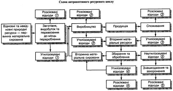 Таким чином, залежно від джерела утворення відходи поділяють на дві групи: відходи виробництва та відходи споживання. Відходи виробництва – це залишки сировини, матеріалів, напівфабрикатів, що утворилися під час виробництва і частково або повністю втратили свої початкові споживні якості. Відходи споживання – це продукція і вироби, що вже споживалися, або супутні їм вироби, що втратили свої споживні якості. Виходячи з можливості утилізації, розрізняють утилізовувані й неутилізовувані відходи. Для перших існує технологія переробки, для других на даному етапі розвитку техніки – не існує. Для безперервного функціонування антропогенного ресурсного циклу необхідно постійно використовувати первинні матеріальні ресурси у зростаючій кількості відповідно до втрат з розсіюваними відходами 1 -5 згідно із законами збереження матерії та енергії. Виходячи з визначення раціонального природокористування, антропогенний ресурсний цикл буде тим ефективнішим, чим менше утворюватиметься розсіюваних відходів і споживатиметься природних ресурсів. Коефіцієнт корисної дії цього циклу визначається різницею між кількістю спожитих первинних матеріальних ресурсів (ПМР) і кількістю розсіюваних відходів (РВ), тобто ККД = (ПМР – РВ)100/ПМР, %. В ідеальному випадку ККД =100 %, якщо кількість розсіюваних відходів дорівнює нулю, однак це з погляду термодинаміки неможливо, що підтверджує наслідок закону розвитку довкілля. Отже, чим менше утворюється розсіюваних відходів, тим менше безповоротно забиратиметься від природи первинних матеріальних ресурсів і менше забруднюватиметься природне середовище. Зменшення кількості розсіюваних відходів та споживання первинних природних матеріальних ресурсів можна досягти, застосовуючи в господарюванні раціональне природокористування. Стосовно технологічних процесів це здійснюють шляхом ресурсозбереження, тобто виробництва продукції за мінімальних витрат сировини, палива та інших енергетичних ресурсів і різних допоміжних матеріалів. До основних напрямів ресурсозбереження належать: 1) застосування безвідходних та маловідходних технологій з одночасною комплексною переробкою сировини; 2) комплексна переробка газодимових викидів та стічних вод з використанням продуктів газо- і водоочищення; 3) рекуперація та утилізація відходів виробництва; 4) застосування замкнених водооборотних циклів; 5) раціональне використання енергоресурсів та енергозбереження; 6) розробка нових ефективних технологічних процесів, у тому числі й мікробіологічних; 7) організація територіально-виробничих комплексів. З метою зменшення кількості розсіюваних відходів та споживання первинних природних матеріальних ресурсів розробляються ефективні безвідходні й маловідходні технології. На промислових підприємствах будують дедалі складніші й дорожчі очисні споруди для газодимових викидів і стічних вод. Розробляють технології комплексної раціональної переробки сировини з мінімальним використанням енергетичних ресурсів та інших допоміжних матеріалів. Незважаючи на те що кількість розсіюваних відходів на одиницю виготовленої продукції стає все меншою, загальний обсяг шкідливих викидів зростає. Це пояснюється невпинним зростанням чисельності населення на планеті, а отже, і його потреб. Найефективнішим шляхом вирішення про