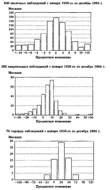 Диаграммы месячных, квартальных и годовых процентных изменений значения индекса Standard & Poor's 500 за период с января 1926-го по декабрь 1995 г. На обследуемом отрезке времени котировки росли в течение 47 из 70 лет, или каждые два года из трех. При этом они падали в течение 23 лет, почти половину этого срока, т. е. в течение десяти лет они выходили за пределы среднего квадратичного отклонения, то есть больше, чем на 12,1%. Среднее же падение за эти 22 несчастливых года составило 15,2%. Достаточно ли 70 наблюдений, чтобы подтвердить вывод о случайном изменении котировок акций? Возможно, нет. Известно, что при бросании кости получаемые результаты случайны, но если бросить кость только шесть раз, то ничего похожего на нормальное распределение мы не увидим. Нужно существенно увеличить число бросков, чтобы результаты стали согласовываться с теорией. Распределение 280 квартальных наблюдений гораздо ближе к нормальной кривой, чем 70 годовых. Но величина дисперсии очень велика и никоим образом не симметрична, поскольку наличествует небольшое число очень значительных изменений. Величина среднего изменения за квартал равна +2,0%, но значение среднего квадратичного отклонения 12,0% говорит, что это значение (+2,0%) вряд ли типично для квартальных изменений. 45% кварталов показали изменения, меньшие чем 2,0%, а 55% — большие. Инвестор, который бы купил портфель акций и держал его 70 лет, заработал бы очень неплохие деньги. Но инвестор, который бы рассчитывал на то, что каждый квартал будет зарабатывать на акциях по 2%, был бы дураком. (Заметьте, что я здесь использую только прошлое время — у нас нет гарантий, что в будущем фондовый рынок будет вести себя так же, как в прошлом.) Распределение 840 помесячных изменений котировок отличается большей упорядоченностью, чем в случае квартальных и годовых изменений. Среднемесячное изменение составило +0,6%. Если мы вычтем 0,6% из каждого наблюдаемого значения, чтобы сделать поправку на постоянный рост котировок за весь рассматриваемый период, то среднее изменение составит +0,00000000000000002%, причем в течение 50,6% месяца оно было положительным, а в течение 49,4% месяца отрицательным. Средняя для первого квартиля составила -2,78%, а для третьего квартиля +2,91%. Почти безупречная симметричность. Случайный характер месячных колебаний проявляется также в кратковременности периодов с постоянным направлением изменения котировок. Сохранение тенденции в течение двух месяцев наблюдалось не более половины исследуемого отрезка времени, и только 9% времени направление изменения котировок не менялось в течение пяти месяцев. Итак, изменение котировок акций носит чисто случайный характер, по крайней мере если судить по 840 месячным наблюдениям, — ведь мы не имели бы такой формы распределения данных вокруг средней, если бы изменения цен не были взаимно независимыми — как результат бросания костей. После внесения поправок на долговременную тенденцию роста частота повышения и понижения котировок практически сравнялись; серии однонаправленных изменений встречались редко; значение коэффициентов изменчивости близко к теоретическому. Считая, что можно руководствоваться предположением Бернулли о сходстве будущего с прошлым, мы вправе использовать эту информацию для вычисления вероятности того, что в некоем месяце котировки изменятся на некую определенную величи