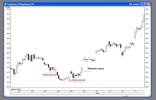 Сценарий ударного дня покупки состоит в закрытии ниже минимума предыдущего дня, что многими воспринимается как медвежий сигнал (это может быть минимум последних 3-8 дней). Однако если на следующий день рынок развернулся и пошел вверх и дошел до максимума предыдущего дня, то в этой точке нужно покупать. Суть в том, что если рынок сумел дойти до этой точки, то значит ситуация на рынке изменилась. Сценарий ударного дня продажи в точности противоположен: рынок закрывается выше максимума предыдущего дня, осуществив тем самым прорыв, но на следующий день рынок разворачивается и идет вниз. Прорыв оказался ложным. Модель ударного дня покупки или продажи отражает известный принцип отрицания: если рынок не сумел сделать то, что он должен был сделать, то это сильный сигнал на то, что он очень скоро попытается сделать нечто противоположное и близка по психологии к свечной модели поглощения. У Ларри Вильямса есть также модель скрытого ударного дня. Это модель указывает нам не на разворот, а на продолжение основной тенденции. Сценарий скрытого ударного дня покупки возникает, если рынок закрывается с повышением, но при этом в нижних 25% диапазона, а еще лучше, если ниже цены открытия. Если на следующий день цена разворачивается и опять несется вверх и достигает максимума предыдущего дня, то это означает, что однодневная коррекция закончилась, и можно опять открывать длинную позицию. Скрытый ударный день продажи в точности противоположен. Рынок закрывается в верхних 25% диапазона и выше открытия дня, но на следующий день разворачивается, и входить нужно в тот момент, когда цена падает ниже минимума скрытого ударного дня. Скрытый ударный день, как правило, возникает на сильном трендовом рынке как день передышки, возникающей после сильного открытия и фиксации частью участников своих прибылей. На рисунке 5.3 скрытый ударный день стал логичным следствием параболического роста последних нескольких ударных дней. После такого бурного роста рынок нуждался в передышке. Эти ценовые модели работают значительно лучше, если они подтверждаются другими торговыми сигналами, исходящими не от ценовой структуры.