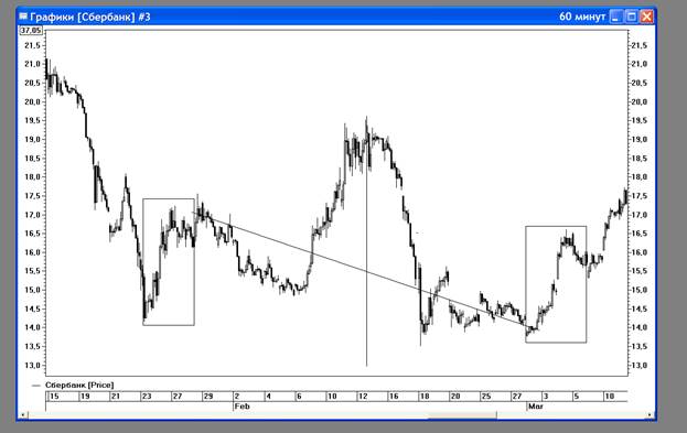 Проходя свои старые уровни, цены очень часто совершают колебания, аналогичные предыдущему движению и возникает зеркальное отображение предыдущего ценового движения. Чаще всего подобное можно наблюдать на 60-минутных графиках. Это явление, скорее всего, можно объяснить наличием в этих зонах каких-то сильных технических факторов, например скоплений фибоузлов, приводящих к повышенной активности участников, а также «привычками» институциональных трейдеров. Основное правило биржевой игры гласит: следуйте тренду. Так почему же тогда так много игроков упускают благоприятные возможности, связанные с игрой в шорт. Роберт Дил в одной из своих книг пишет, что только 2% американцев когда-либо шортили акции. Это тем более странно, что рынки по статистике падают на 60-80% быстрее, чем растут и таким образом позволяют получить быструю прибыль.. Причина, думается, кроется в том, что инвестору психологически трудно решиться осуществить короткие продажи акций, если он привык зарабатывать на их росте. Другая причина состоит в страхе перед резким «сжатием» шортов, когда игроки покрывают свои короткие позиции, что ведет к резкому взлету котировок. «Сжатие»,как правило, начинается в момент завершающей стадии распродаж, когда стремительное падение цен привлекает внимание неопытных участников и они совершают запоздалое открытие торговых позиций. Взлет цен может быть очень сильным и стремительным, гораздо сильнее, чем коррекция во время роста. Прекратиться это, отличающееся сильной волатильностью, «сжатие шортов» может так же быстро, как и начаться. Дойдя до зон сильных сопротивлений, рынок может внезапно остановиться, и после непродолжительной консолидации вновь упасть. Дальнейший рост требует реального спроса со стороны институциональных игроков, а они не в состоянии так быстро менять свое мнение о рынке. Некоторые трейдеры способны чувствовать эту верхнюю точку сжатия, когда покупательский спрос иссякает и появившиеся крупные заявки на продажу от институционалов свидетельствуют о продолжении основной тенденции. Механизм, управляющий действиями толпы во время восходящей и нисходящей рыночных тенденций, различный. Если подъемом цен движет алчность толпы, то сильное падение цен вызывают страх и боль. Жадность исчерпывает себя быстрее, чем страх, для избавления от которого требуется время. Во время серьезных падений маркетмейкеры резко снижают свою активность, а то и вовсе уходят с рынка. Это может породить панические распродажи акций и их падение «в пол». Некоторые малоликвидные акции, не пользующиеся вниманием маркетмейкеров, в моменты обвальных падений могут быть распроданы до нереально низких цен просто из-за того, что кто-то в панике бросит большой пакет акций по рынку. Погоня за импульсами, движущими рынок вниз, для трейдера, не обладающего достаточным опытом, очень опасна. Гораздо лучше и безопаснее стратегия продаж от уровней сопротивления.