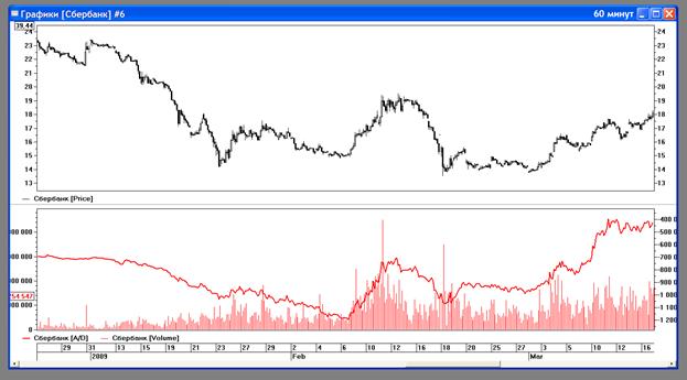 Рис.8.11 Индикатор A/D характеризуется более плавным движением, чем индикатор OBV и показывает направление, в котором идет поток покупок/продаж.
