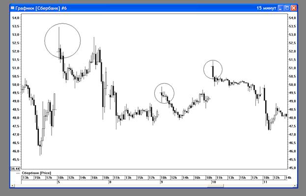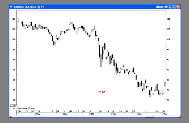 Рис.9.7 Появление шипа на графиках в большинстве случаев является проявлением истерии. В условиях паники, возникшей в результате проделок Жерома Кервьеля, несколько тысяч лотов, брошенных 22 января 2008 г. в пустой стакан, способны были обвалить на 20% цену на такую ликвидную ценную бумагу, как Сбербанк.