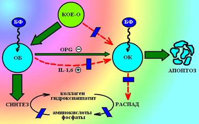 · Бисфосфонаты нарушают процесс перехода гидроксиаппатита в растворимые фосфаты (т.е. процесс деминерализации кости), а в более высоких дозах способны нарушить и процесс минерализации (связывания растворимого кальция костным матриксом). · Бисфосфонаты проникают в остеобласты и увеличивают синтез в них остеопротегерина (остеокласт-ингибирующего фактора) и снижают синтез IL-1 и –6 (которые нобходимы для стимуляции остеокластов). В итоге, снижается активность остеокластов и их способность к резорбции костной ткани. · Бисфосфонаты проникают в остеокласты и нарушают активность тирозинкиназ (ферментов, необходимых для внутриклеточной передачи сигналов от рецепторов на поверхности клетки). В итоге, запускаются процессы апоптоза остеокластов и снижается образование новых остеокластов из предшественников. · Блокируют 1a-гидроксилазу почек и замедляют скорость образования кальцитриола (активной формы витамина D). Это способствует нарушению всасывания кальция в кишечнике и увеличению его выделения с мочой. · Снижают синтез щелочной фосфатазы в эпителии кишечника, которая необходима для процесса захвата свободного кальция из просвета кишки и его транспорта в кровь.