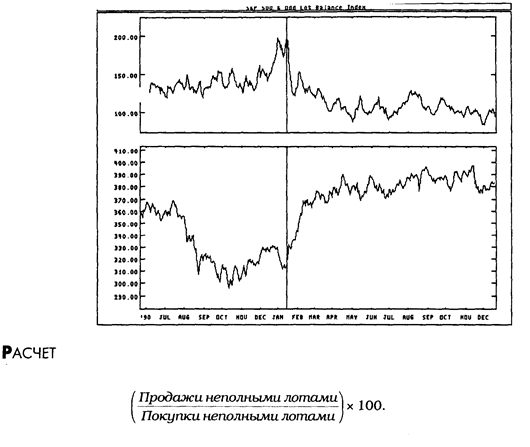 ОПРЕДЕЛЕНИЕ БАЛАНСОВЫЙ ОБЪЕМ ПРИМЕР ИНТЕРПРЕТАЦИЯ Если значение индекса ОLBI велико, значит мелкие трейдеры продают активнее, чем покупают, то есть они считают, что рынок будет понижаться. Вам следует действовать вопреки торговцам неполными лотами: покупать, когда они продают (на это указывают высокие значения OLBI), и продавать, когда торговцы неполными лотами охвачены бычьими настроениями и покупают (на это указывают низкие значения OLBI). Дневные колебания индекса OLBI можно сгладить с помощью 10дневного скользящего среднего. На следующем рисунке показаны графики индекса S&Р 500 (нижнее окно) и 10дневного скользящего среднего индекса баланса неполных лотов (верхнее окно). Вертикальной линией отмечен момент, когда торговцы неполными лотами были настроены крайне пессимистично. Очевидно, что это была очень благоприятная возможность для покупки.