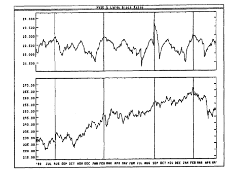 Интерпретация. На следующем рисунке показаны графики индекса Ньюйоркской фондовой биржи и коэффициента крупных пакетов