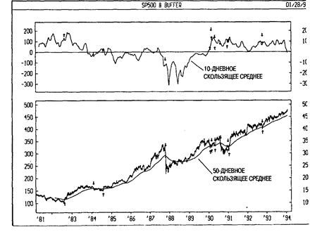 ПРИМЕР На следующем рисунке изображены графики индекса S&Р 500 и 1 дневного скользящего среднего индикатора NH-NL. Здесь индикатор NH-NL используется для подтверждения обычной системы торгов. на основе скользящего среднего. Стрелки «покупка» ставились та где индекс S&P 500 поднимался выше своего 50дневного скользящего среднего, но только если при этом и 10дневное скользящ среднее индикатора NH-NL находилось выше нуля. Стрелки «продажа» проставлены везде, где индекс S&Р 500 опускался ниже свое скользящего среднего. Путем отсеивания тех сигналов к покупке, которые не были подтверждены положительными значениями 10дневного скользящего среднего индикатора NH-NL, удалось уменьшить число сделок на 50% увеличить прибыль на 9%.