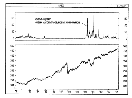 OБЪЕМ ПРИМЕР ИНТЕРПРЕТАЦИЯ ОПРЕДЕЛЕНИЕ Новые максимумы — новые минимумы. РАСЧЕТ Индикатор разности новых максимумов и минимумов определяется как разность между числом акций, достигших новых 52недельных максимумов, и числом акций, достигших новых 52недельных минимумов. Полученная кривая обычно сглаживается с помощью 10дневного скользящего среднего. НОВЫХ МАКСИМУМОВ/МИНИМУМОВ КОЭФФИЦИЕНТ (NEW HIGHS/LOWS RATIO) Коэффициент новых максимумов/минимумов ("NH/NL Ratio") показывает отношение числа акций, достигших за день новых 52недельных максимумов, к числу акций, достигших новых 52недельных минимумов. Коэффициент NH/NL,— еще один инструмент, позволяющий наглядно представить соотношение акций, достигших новых максимумов и минимумов. Высокие значения индикатора указывают на то, что большое количество акций установило новые максимумы (по сравнению с числом акций, опустившихся до новых минимумов). Значения ниже 1 говорят о том, что новых максимумов достигло меньше акций, чем новых минимумов. Дополнительные сведения об интерпретации коэффициента NH/NL можно найти в разделе, посвященном индикатору разности новых максимумов и минимумов (см. стр. 108). На следующем рисунке показаны графики индекса S&Р 500 и коэффициента NH/NL. Начало повышения индекса в 1990 году сопровождалось резким скачком коэффициента. Однако, хотя индекс продолжал расти и дальше, коэффициент не смог достичь новых максимумов. Это признак того, что рынок слабее, чем можно судить по динамике индекса S&Р 500.