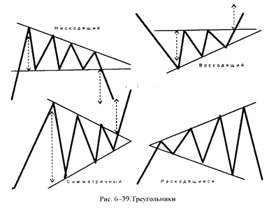 Фигуры продолжения Общие правила для фигур разворота Общий подход к фигурам разворота — не спешить и дожидаться окончательного формирования фигуры, так как необходимо учитывать возможный вариант ложного развития этих фигур. Ложные фигуры возникают достаточно часто, чтобы можно было пренебрегать таким вариантом развития событий. Фигуры разворота рекомендуется искать только на недельных и месячных графиках, поскольку период развития таких фигур обычно длится от нескольким недель до нескольких месяцев. Поэтому анализ их на дневных графиках не очень значим. Формирование фигур должно обязательно подтверждаться объемами. Если последние не подтверждают формирование фигуры, то, скорее всего, ваш анализ неверен. Особенное значение имеет существенный рост объемов при пробитии линии Шеи. Временный откат к линии Шеи как к линии сопротивления — частая, но не обязательная ситуация после пробития ее. Предполагаемая цель, после того как фигура закончила свое формирование, как правило, равна наибольшей высоте этой фигуры и откладывается от точки пробития линии Шеи. Достижение этой цели может продлиться достаточное количество времени, и точное ее значение может быть не достигнуто. Так что цель нужно воспринимать только как приблизительный ориентир. Фигуры продолжения обычно возникают при временной коррекции основного тренда, поэтому важно, чтобы он был ярко выражен. Наиболее часто встречающиеся фигуры — Треугольники (triangles). В зависимости от расположения линий поддержки и сопротивления выделяются четыре типа Треугольников: симметричный (symmetrical), восходящий (ascending), нисходящий (discending) и расширяющийся (expanding) (см. рис. 6-39). Восходящий Треугольник чаще всего корректирует «медвежий» тренд, а нисходящий — «бычий». После завершения Треугольника можно ожидать продолжение тренда. Момент окончания Треугольника можно определять следующим образом. • Внутри Треугольника можно заметить нечетное, но обычно не меньше пяти, количество колебаний, или волн. • Симметричный, восходящий или нисходящий Треугольники заканчиваются, как правило, близко к точке пересечения своих границ. • Бели сторону Треугольника разбить на четыре части, то наиболее вероятным является его пробитие в диапазоне от 1/2 до 3/4 длины стороны. После пробития границ целью является величина первого колебания внутри Треугольника — максимальная ширина Треугольника. Наиболее сильный удар при пробитии одной из его сторон возникает в том случае, если последняя волна в нем не доходит до границы.