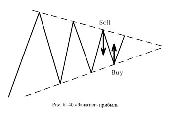 Не рекомендуется торговать внутри Треугольника — большая возможность потерь. Тем не менее при окончании этих фигур необходимо вступать в игру, так как работает эффект сжатой пружины, когда сильно зажатые в узком диапазоне цены вырываются из него с большой скоростью и силой, проходя очень большое расстояние. Однако можно торговать и внутри Треугольника, если вы используете возможность прибыльного локирования на границах. Действительно, если вам удастся открыть противоположные позиции на границах Треугольника навстречу друг другу, то независимо от того, в какую сторону будет его пробитие, вы сможете закрыть убыточную позицию и позволить увеличиваться прибыли от второй. Поскольку между двумя позициями уже находится потенциальная прибыль, вы никогда не сможете понести потери в такой ситуации. Правда, надо отдавать себе отчет, что тогда вы можете надолго «заморозить» часть капитала, ибо колебания внутри Треугольника могут происходить еще достаточно долго.