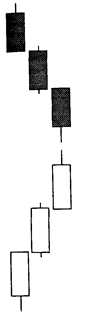 Такие последовательности из трех свечек дают сигнал о возможном развороте тренда. Этот сигнал оказывается особенно важным, когда является коррекцией после очень сильного движения. Трудность использования анализа свечек для прогнозирования состоит в том. что нет четких определений таким понятиям, как «длинное тело» или «большие тени». Поэтому, анализируя свечки, приходится во многом полагаться на здравый смысл и зрительное восприятие графика. Наибольшее внимание, на наш взгляд, необходимо уделять не абсолютным размерам тела и тени свечки, а соотношению между ними.