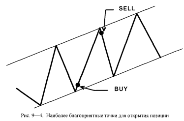 При наличии явно выраженного тренда и тем более наличие канала позволяют выбирать наиболее благоприятные точки входа в рынок. В самом деле, покупать необходимо в самой нижней точке канала около линии поддержки (см. рис. 9—4). Естественно, открывать позицию наиболее безопасно на отскоке от этой линии, так как мы не можем знать наверняка, будет пробит данный уровень или нет. Открытие позиции на отскоке происходит уже после подтверждения силы линии поддержки и «бычьего» тренда.