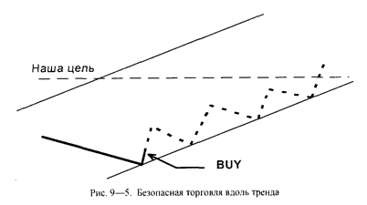 Безопасность торговли вдоль тренда заключается в следующем: при сохранении тренда рано или поздно наша цель будет достигнута (см. рис. 9—5). Единственная неприятность, которая нас поджидает, состоит в том, что это может занять достаточно много времени, а это снижает эффективность нашей работы, несмотря на получение прибыли. На рисунке видно, что при торговле вдоль тренда, как бы цена ни сопротивлялась достижению нашей цели, наличие «бычьего» тренда приведет к тому, что цель все-таки будет достигнута.