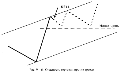 При торговле против тренда вы можете никогда не дождаться вашей цели (см. рис. 9—6). На рисунке видно, что при такой торговле даже минимальная цель может быть не достигнута, так как «бычий» тренд может не допустить понижение цен до этого уровня. Поэтому торговля против тренда опасна даже при кратковременных позициях.