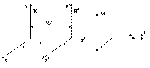 Екі К және К¢ санақ жүйелерін қарастырайық. Қозғалмайтын К жүйесіне қатысты К¢ жүйесінің жылдамдығы Қозғалмайтын К жүйесінде М нүктесінің координаталарын х, у, z, ал оның К¢ жүйесіндегі координаталарын х', у', z' деп белгілейік. Мысал ретінде бірқалыпты түзу сызықты қозғалыстағы кемені алайық. Кеме каютасында бір дене