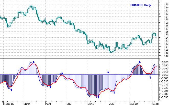 Рис.3. Сигналы, основанные на пересечениях MACD и сигнальной линии. Стрелками вверх обозначены точки покупки, стрелками вниз - точки продаж. И, наконец, стандартный прием анализа всех осцилляторных индикаторов - дивергенция индикатора и графика цен (рис.4).