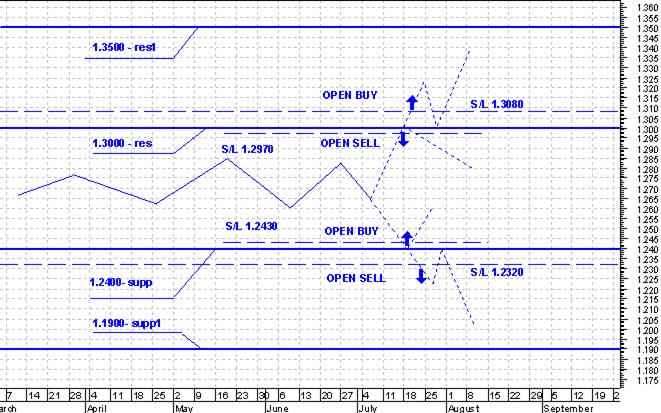 Рис.1. Торговый план REVERSE. Итак, цена у нас находится в диапазоне между уровнями поддержки и сопротивления и у нас имеется составленный торговый план RANGE, предусматривающий наши действия при движении рынка внутри торгового диапазона: OPEN BUY LIMIT 1 LOT - 1.2400. OPEN SELL LIMIT 1 LOT - 1.3000, Мы открываем позиции на краях диапазона внутрь и фиксируем прибыль на противоположной стороне диапазона. Если цена выходит за пределы диапазона мы ограничиваем наши потери с помощью ордеров стоп-лосс. Но что означает то, что цена в рамках бокового тренда вышла за пределы некоторого торгового диапазона? Преодоление важного уровня поддержки/сопротивления вследствие перемены ролей превращает его в свою противоположность. Если цена прорывает уровень сопротивления, то он превращается в уровень поддержки и диапазон движения рынка задается теперь новой парой уровней поддержка-сопротивление. Аналогично, при прорыве уровня поддержки он превращается в новый уровень сопротивления. Таким образом то, что цена вышла за пределы первоначального торгового диапазона и мы зафиксировали убыток означает также, что цена вышла в новый торговый диапазон, ограниченный новыми уровнями поддержки и сопротивления. В соответствии с этим мы составляем торговый план REVERSE, предусматривающий наши действия на случай выхода цен из прежнего торгового диапазона. Вернемся немного назад. В рамках торгового плана RANGE при достижении ценой уровня сопротивления мы открывали позицию на продажу. Если уровень сопротивления преодолевается, цена продолжает двигаться дальше вверх, а открытая позиция приносит нам убытки, величина которых ограничена уровнем стоп-лосс. Достижение ценой уровня стоп-лосс фиксирует величину убытка и одновременно свидетельствует нам, что выход цены за пределы прежнего диапазона был не случаен, а уровень сопротивления превратился в свою противоположность - стал новым уровнем поддержки. Цель движения цены - новый уровень сопротивления, полученный нами в результате анализа графика цен. В рамках плана REVERSE при срабатывании стоп-лосс, когда у нас закрывается предущая позиция, мы одновременно открываем позицию в противоположном направлении: OPEN BUY STOP 1 LOT - 1.3080. Где будет фиксироваться прибыль? На следующем уровне сопротивления, полученном из анализа графика цен: