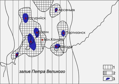 Рис. 3.9. Распределение концентраций загрязняющих веществ в атмосферном бассейне Южного Приморья (Долговременная программа…, 1993): 1 – низкая, 2 – средняя, 3 – высокие концентрации Однако, основное загрязняющее воздействие оказывает 3 группы техногенных источников: 1) транспорт, 2) ТЭК, 3) промышленные предприятия с общими объёмами 250–300 тыс.т выбросов ЗВ. Приоритетными поллютантами атмосферного воздуха в большинстве городов и районов края являются (Христофорова, 2005): взвешенные вещества (ВВ), оксиды азота, оксид углерода, диоксид серы, сероводород, бензапирен. По данным мониторинга, в крае в зоне вредного воздействия поллютантов атмосферы проживает около 1,3 млн человек (64% населения). Значительный вклад (от 30 до 70%) в загрязнение крупных городов края вносит автотранспорт, подавляющая часть которого по выбросам не соответствует принятым нормативам. Учитывая, что многие из этих городов располагаются вблизи магистралей федерального значения с активным грузопотоком, это приводит к ухудшению экологической ситуации и росту заболеваемости населения. Это усугубляется тем, что промышленные предприятия, и особенно ТЭК края (теплоэлектроцентрали и котельные), используя уголь и мазут, являются крайне устаревшими и изношенными, имеют низкую экологическую эффективность пылегазоочистки (у определенной части котельных нет фильтров). Самая значительная часть ТЭКа сконцентрирована на юге края, хотя самой крупной является Лучегорская ГРЭС с рекордными выбросами ЗВ (до 60,6 тыс. т в год). Как следствие, ведущей патологией для всех возрастных групп населения последних десятилетий являются болезни органов дыхания. Следует сказать, что действие выбросов транспорта (автомобилей, тепловозов, судов) определяется не весовым вкладом входящих в их состав веществ, а их более высокой токсичностью и негативным действием на организм человека, чем выбросов от стационарных источников. Интегральная оценка экологического риска распространения заболеваемости органов дыхания в городах края (Кику, Гельцер, 2004) показала, что наибольший риск установлен во Владивостоке. При этом данный риск от загрязнения воздухом автомобилями в 4–5 раз выше, чем от выбросов промпредприятий. По величине экологического риска выделяются города Находка, Артем, Уссурийск, а лидирует Владивосток с экстремально высокой величиной – 65,2–89,9 (рис. 3.10).