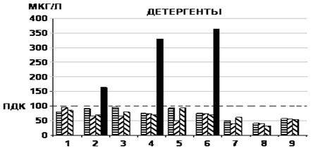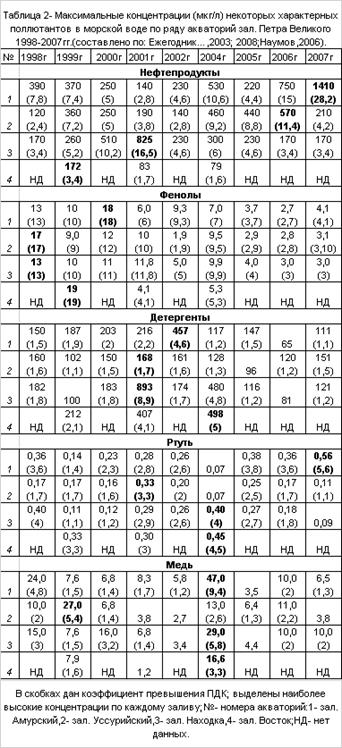 Рис. 3.12. Средние концентрации по детергентам, ртути и меди в морской воде по ряду акваторий зал. Петра Великого за 1998–2007 гг. (составлено по: Ежегодник …, 2003, 2008; Наумов, 2006). Условные обозначения см. рис. 3.15 Таблица 3.9 Максимальные концентрации (мг/л) некоторых характерных поллютантов в морской воде по ряду акваторий зал. Петра Великого 1998–2007 гг. (составлено по: Ежегодник…, 2003, 2008; Наумов, 2006)