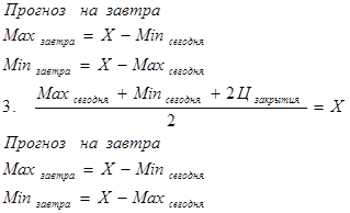 Если цена открытия оказывается в пределах прогноза ценового диапазона, то дневному трейдеру следует ожидать, что уровень сопротивления будет находиться на Max, а уровень поддержки - на Min. Если цена открытия вышла за пределы прогноза, то, скорее всего она уйдет в сторону прорыва.