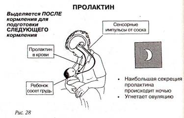 Каждый раз во время сосания ребенком груди происходит стимуляция нервных окончаний соска. Эти нервы посылают сигнал в переднюю долю гипофиза, регулирующую процесс лактации и способствующую выработке молока. Пролактин начинает работать после того, как ребенок пососет грудь, благодаря чему вырабатывается молоко для следующего кормления. Таким образом, процесс сосания ребенком груди заставляет ее вырабатывать молоко. Эти процессы, от стимуляции соска до секреции молока, называются рефлексом секреции молока или рефлексам пролактина(рис. 28).