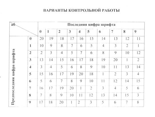 РАБОТЫ МЕТОДИЧЕСКИЕ УКАЗАНИЯ ПО ВЫПОЛНЕНИЮ КОНТРОЛЬНОЙ Контрольная работа по каждому варианту включает два теоретических вопроса и задание. Работа должна быть оформлена грамотно и быть читаемой. Перед каждым ответом нужно писать номер и полный текст вопроса. Ответ на новый вопрос необходимо начинать с начала страницы. В конце работы приводится список использованной литературы (указывается фамилия автора, полное наименование учебника, учебного пособия, брошюры, журнала, газеты, место издательства, год издания), Интернет-ресурсы; затем следует подпись студента и дала выполнения работы. Для рецензии преподавателя оставляют два чистых листа. Работа может быть выполнена в письменном или в компьютерном виде. Выполненная работа представляется в учебное заведение в установленные графиком сроки. Работа оценивается «зачтено» или «не зачтено». Студент, получивший контрольную работу с положительной оценкой знакомится с рецензией и с учетом замечаний преподавателя дорабатывает отдельные вопросы с целью углубления своих знаний. Незачтенная контрольная работа возвращается студенту с подробной рецензией, содержащей рекомендации по устранению ошибок, для повторного выполнения. Работа выполняется студентом вновь и сдается вместе с незачтенной работой на проверку этому же преподавателю. Контрольная работа, выполненная не но своему варианту, возвращается без проверки. В случае возникновения проблем при выполнении контрольной работы следует обращаться к преподавателю за консультацией. ВЫБОР ВАРИАНТА КОНТРОЛЬНОЙ РАБОТЫ Вариант контрольной работы определяется по таблице в зависимости от двух последних цифр личного шифр студента.