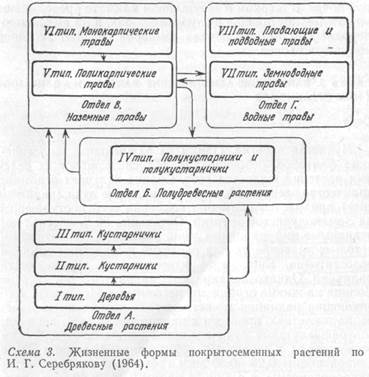 Существуют и другие схемы классификаций жизненных форм. Наибольшее признание получила классификация злаков по способу кущения, разработанная В. Р. Вильямсом. Г. Н. Высоцкий и Л. И. Казакевич в основу классификации жизненных форм положили характер подземных органов и способность растений к вегетативному размножению. В последнее время удачную классификацию покрытосеменных растений предложил И. Г. Серебряков, сосредоточив внимание на структуре и длительности жизни надземных скелетных осей. Он выделяет 4 отдела и 8 типов жизненных форм этих растений (схема 3). Каждый тип в свою очередь подразделяется на формы. К примеру, в I типе выделяются надземные кронообразующие деревья с прямостоячими стволами; кустовидные, одноствольные с низкими стволами; стланцы (с лежачими стволами). Жизненные формы, доминирующие в том или ином сообществе, могут служить индикаторами условий обитания. Так, преобладание столонообразующих растений в широколиственных и темнохвойных лесах свидетельствует о малоплодородной, рыхлой и избыточно увлажненной почве. В жарком и засушливом климате преобладают животные, обитающие в глубоких норах, а на высокоплодородных и рыхлых почвах землерои создают большое количество ходов. Глава 5. ВАЖНЕЙШИЕ АБИОТИЧЕСКИЕ ФАКТОРЫ И АДАПТАЦИИ К НИМ ОРГАНИЗМОВ