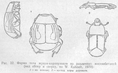 Жизненные формы таких мелких почвенных членистоногих, как коллемболы, выделяют на основе приуроченности их к определенным слоям почвенного профиля, так как в почве с глубиной резко меняется весь комплекс условий обитания: размеры полостей, освещенность, режим температуры и влажности и т. п. Атмобионты — виды, населяющие верхние слои подстилки и способные подниматься на нижние части растений, характеризуются более крупными размерами, полностью развитыми глазами, относительно длинными придатками (антеннами, ногами и прыгательной вилкой), хорошо выраженной пигментацией. Эуэдафические виды — обитатели минеральных тонкопорозных слоев почвы — отличаются мелкими размерами, сильным укорочением придатков, редукцией вилки, полным отсутствием глаз и пигмента. Гемиэдафические формы характеризуются промежуточными чертами: частичной редукцией глаз, рассеянным пигментом, укороченной вилкой и др. Среди саранчовых по форме (конфигурация тела, структура головы, строение конечностей, летательного аппарата, тип покровительственной окраски) хорошо различаются тамнобионты — обитатели кустарников и деревьев; населяющие травянистый ярус хортобионты; жители надпочвенного слоя органических остатков герпетобионты; обитатели открытых участков грунта: эремобионты — на поверхности плотных глинистых почв, псаммобионты — на песках и петробионты — на каменистых участках с разреженной растительностью. Сходные жизненные формы встречаются в сходных условиях жизни в разных зоогеографических областях и на разных материках (например, тушканчики Евразии, кенгуровые крысы Австралии, прыгунчики Африки) Жизненная форма наглядно свидетельствует об образе жизни вида.