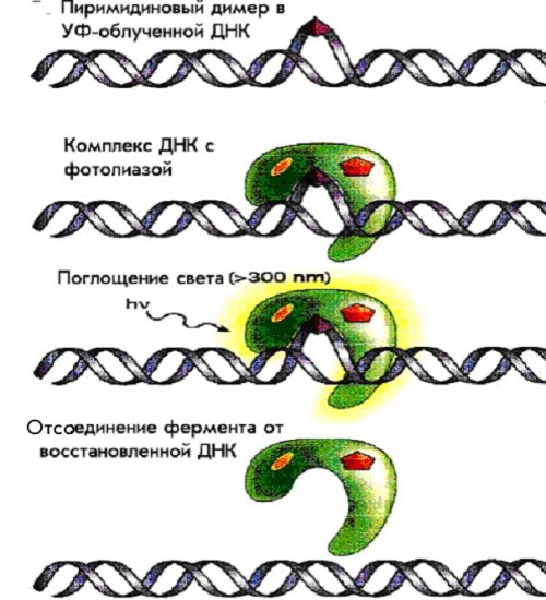 Обычно ДНК в клетках находятся в так называемой В-форме, когда плоскости оснований параллельны друг другу и расстояние между плоскостями равно примерно 3,4 А. Это расстояние оказывается как раз таким, чтобы освободившиеся при УФ-облучении валентности между С5=С6 атомами пиримидпновых оснований, расположенных рядом в цепи ДНК, могли замкнуться друг на друга и сформировать более сложное, так называемое циклобутановое кольцо. Если димеризация произошла в РНК, то могут возникнуть димеры урацила и любого другого пиримидинового основания. Довольно часто употребляют и другой термин для их обозначении – пиримидиновые димеры. В зависимости от того, какие основания соединены в димер, их называют димерами тимина, димерами цитозина или тимин-цитозиновыми димерами. Сущность процесса фотореактивации, изображенного на рис. 2, заключается в том, что фермент фотолиаза расщепляет вновь образовавшиеся связи между соседними основаниями и восстанавливает нативную структуру ДНК. В 1963 году фотолиаза E. coli была выделена и очищена. Этот белок кодируется геном phr, а линии с мутациями гена phr имеют дефекты световой репарации. Все описанные к настоящему времени участвующие в фотореактивации белки относятся к семейству фотолиазкриптохромов. Фотолиазы были найдены у бактерий, дрожжей, дрозофилы, ксенопуса, иглокожих, но не у высших млекопитающих, включая человека. Эти белки являются мономерами с молекулярным весом 55–70 кд, имеющими два нековалентно связанных хроматофора: первый хроматофор это флавин, а второй – фолат (или дезафлавин). Фотолиаза светонезависимым образом (то есть в темноте) связывается с вызванным УФ-облучением повреждением ДНК. Сама же реакции репарации является светозависимой. Фотолиаза может восстанавливать как пиримидиновые димеры, так и (6–4)фотопродукты – другой тип повреждения ДНК, обычно возникающий под действием УФ-облучения. При образовании этого фотопродукта новые связи возникают между 6 и 4 атомами углерода соседних оснований, оно менее устойчиво, чем пиримидиновые димеры, и поэтому не является такой удобной экспериментальной моделью и несколько хуже изучено. После расщепления связей в поврежденных основаниях и восстановления их формы фотолиаза отходит от ДНК. Прямое восстановление структуры ДНК на этом завершено. Это единственная пока найденная ферментная реакция, в которой фактором активации служит не химическая энергия, а энергия видимого света. Все остальные типы репарации не требуют активации светом и потому первое время носили собирательное название "темновая репарация". Сейчас этот термин практически не встречается. У человека белки – гомологи фотолиаз участвуют не в процессах репарации, а в регуляции циркадного ритма. Были клонированы гены hCry1, hCry2, mCry1, mCry2 (human/mouse circadian rythm). Эти гены экспрессируются в самых разных тканях – мозгу, печени, яичках, сетчатке и действуют, как циркадные проторецепторы. Вероятно, они являются антагонистами, так как у мышей дефектных по mCry1 циркадные периоды укорачиваются, а у дефектных по mCry2 – напротив, удлиняются. Гены Cry представляют собой очень интересный пример эволюционного изменения функции репарационных генов.