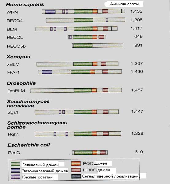 Рисунок 30. Сравнительное строение RecQ-подобных геликаз у различных видов.