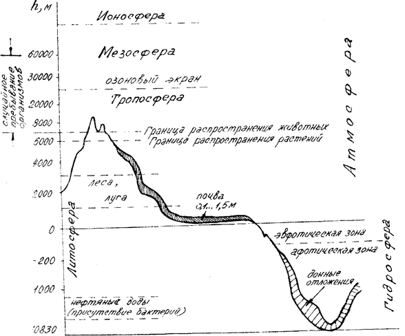 Второй компонент биосферы назван В.И. Вернадским биогенным веществом. Оно представлено горючими ископаемыми и осадочными породами, образование которых связано с жизнедеятельностью живых организмов (известняк, мел и т.д.). Третьим компонентом является косное вещество, т.е. магматические, не биогеннные осадочные и метаморфические породы. Четвертый компонент - биокосное вещество - сочетает в себе свойства живого и косного вещества. Он представлен почвой, уникальным природным образованием, обладающим плодородием и являвшимся основным средством сельскохозяйственного производства (детально см. подраздел 5.3). К перечисленным 4 компонентам в последнее время добавляются радиоактивные вещества (РВ), рассеянные атомы и вещество космического происхождения (метеориты, космическая пыль). Биосфера является особой живой оболочкой нашей планеты. Ее протяженность по вертикали представлена на рис. 2.1. Нижним пределом биосферы можно считать изотерму 100°С (критическая температура для развития бактерий), проходящую на глубине земной коры от 1500 до 15000 м. Живые организмы обнаруживались на глубине земной коры до 1700 м, на дне океана до 11000 м и в рассолах с концентрацией 250 г/л. Верхняя граница проникновения животных лежит на высоте 7000 м. Есть сведения, что живые организма проникают до высоты озонового слоя (7...8 км на полюсах и 20...25 км на экваторе). Приведенные цифры не является окончательными и могут быть уточнены при новых исследованиях.