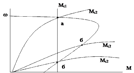 Рисунок 7 – К определению устойчивости: для Мс1 точка а – устойчивый режим работы, точка б – неустойчивый; для Мс2 точки а,б - устойчивы