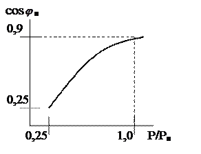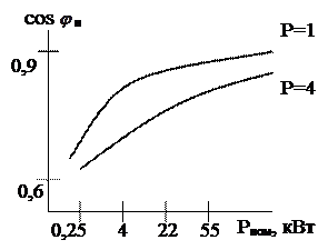 Cos Работа ЭП, как и любого другого потребителя характеризуется коэффициентом мощности сos где S – полная мощность. Если Q не потребляется, то сos Значение коэффициента мощности в значительной степени зависит от мощности, частоты вращения и загрузки электродвигателя (рисунок 4,5). Таким образом, основными мероприятиями по повышению cos - естественные: 1) выбор двигателя в строгом соответствии с потребляемой мощностью рабочей машины; 2) выбор высокоскоростных двигателей; 3) при эксплуатации, уменьшение времени холостого хода; - искусственные: 1) использование статических конденсаторов и синхронных компенсаторов.
