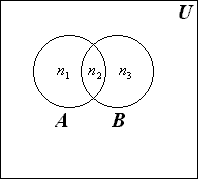 Определение 1.2. Если каждому элементу множества A сопоставлен единственный элемент множества B и при этом всякий элемент множества B оказывается сопоставленным одному и только одному элементу множества A, то говорят, что между множествами A и B существует взаимно однозначное соответствие. Множества A и B в этом случае называют эквивалентными или равномощными. Эквивалентность множеств обозначается следующим образом: A ~ B. Эквивалентность множеств обладает следующим свойством транзитивности. Если A ~ B и B ~ C, то A ~ C. Докажем это свойство. Так как A ~ B, то для всякого элемента a Î А существует единственный элемент b Î B. Но так как B ~ C, то для всякого элемента b Î B существует единственный элемент c Î C. Сопоставим этот элемент элементу a Î А. Значит, для всякого элемента a Î А существует единственный элемент c Î C и для всякого элемента c Î C существует единственный элемент a Î А. Следовательно, A ~ C. Очевидно, что два конечных множества эквивалентны тогда и только тогда, когда количество элементов в них одинаково. Например, множества А = {4, 5, 6} и В = { x, y, z } эквивалентны, A ~ B. Взаимно однозначное соответствие может быть установлено между элементами 4 и x, 5 и y, 6 и z. Мощностью конечного множества А (обозначается ç А ç) называется число элементов этого множества. Например, мощность множества А = {1, 2} равна ç А ç= 2. Пример 1.17. Ранее (разд. 1.1) мы рассматривали множество всех подмножеств данного множества А, которое называется множеством-степенью и обозначается P (A). Множество P (A) состоит из 2 n элементов. Таким образом, ç P (A) ç = 2 n. Рассмотрим задачу определения мощности объединения n конечных множеств. Пусть n = 2 и A и B – два пересекающихся множества. Докажем с помощью диаграммы Эйлера – Венна следующее соотношение: ç А È B ç= ç А ç+ ç B ç– ç А Ç B ç. (1.1) Из рис. 1.3 видим, что ç А È B ç= n 1+ n 2+ n 3; ç А ç= n 1+ n 2; ç B ç= n 2+ n 3; ç А Ç B ç= n 2.