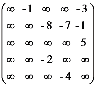 Рис. 3.11 Шаг 1. Введем число вершин графа n =5. Матрица весов этого графа после замены знаков при длинах дуг на противоположные имеет вид: C = Шаг 2. Положим k = 0, l 1(0) = 0, l 2(0) = l 3(0) = l 4(0) = l 5(0) = Шаг 3. k = 1. l 1(1) = 0. Равенство (3.1) для k = 1 имеет вид: li (1) = l 2(1) = min { l 1(0) + c 12; l 2(0) + c 22; l 3(0) + c 32; l 4(0) + c 42; l 5(0) + c 52;} = min {0 – 1; ¥ + ¥; ¥ + ¥; ¥ + ¥; ¥ + ¥} = –1. l 3(1) = min { l 1(0) + c 13; l 2(0) + c 23; l 3(0) + c 33; l 4(0) + c 43; l 5(0) + c 53;} = min {0 + ¥; ¥ – 8; ¥ + ¥; ¥ – 2; ¥ + ¥} = ¥. l 4(1) = min { l 1(0) + c 14; l 2(0) + c 24; l 3(0) + c 34; l 4(0) + c 44; l 5(0) + c 54;} = min {0 + ¥; ¥ – 7; ¥ + ¥; ¥ + ¥; ¥ – 4} = ¥. l 5(1) = min { l 1(0) + c 15; l 2(0) + c 25; l 3(0) + c 35; l 4(0) + c 45; l 5(0) + c 55;} = min {0 – 3; ¥ – 1; ¥ + 5; ¥ + ¥; ¥ + ¥} = –3. Полученные значения li (1) занесем во второй столбец табл. 3.2. Убеждаемся, что второй столбец, начиная со второго элемента, совпадает с первой строкой матрицы весов, что легко объясняется смыслом величин li (1), которые равны длине минимального пути из первой вершины в i -ую, содержащего не более одной дуги. k = 2. l 1(2) = 0. Равенство (3.1) для k = 2 имеет вид: li (2) = l 2(2) = min {0 – 1; –1 + ¥; ¥ + ¥; ¥ + ¥; –3 + ¥} = –1. l 3(2) = min {0 + ¥; –1 – 8; ¥ + ¥; ¥ – 2; –3 + ¥} = –9. l 4(2) = min {0 + ¥; –1 – 7; ¥ + ¥; ¥ + ¥; –3 – 4} = –8. l 5(2) = min {0 – 3; –1 – 1; ¥ + 5; ¥ + ¥; –3 + ¥} = –3. Полученные значения li (2) занесем в третий столбец табл. 3.2. Величины li (2) равны длине минимального пути из первой вершины в i -ую, содержащего не более двух дуг. k = 3. l 1(3) = 0. Равенство (3.1) для k = 3 имеет вид: li (3) = l 2(3) = min {0 – 1; – 1 + ¥; – 9 + ¥; –8 + ¥; – 3 + ¥} = – 1. l 3(3) = min {0 + ¥; – 1 – 8; – 9 + ¥; –8 – 2; – 3 + ¥} = – 10. l 4(3) = min {0 + ¥; – 1 – 7; – 9 + ¥; –8 + ¥; – 3 – 4} = – 8. l 5(3) = min {0 – 3; – 1 – 1; – 9 + 5; –8 + ¥; – 3 + ¥} = – 4. Полученные значения li (3) занесем в четвертый столбец табл. 3.2. Величины li (3) равны длине минимального пути из первой вершины в i -ую, содержащего не более трех дуг. k = 4. l 1(4) = 0. Равенство (3.1) для k = 4 имеет вид: li (4) = l 2(4) = min {0 – 1; – 1 + ¥; – 10 + ¥; – 8 + ¥; – 4 + ¥} = – 1. l 3(4) = min {0 + ¥; – 1 – 8; – 10 + ¥; – 8 – 2; – 4 + ¥} = – 10. l 4(4) = min {0 + ¥; – 1 – 7; – 10 + ¥; – 8 + ¥; – 4 – 4} = – 8. l 5(4) = min {0 – 3; – 1 – 1; – 10 + 5; – 8 + ¥; – 4 + ¥} = – 5. Полученные значения li (4) занесем в пятый столбец табл. 3.2. Величины li (4) равны длине минимального пути из первой вершины в i -ую, содержащего не более четырех дуг. Таблица 3.2