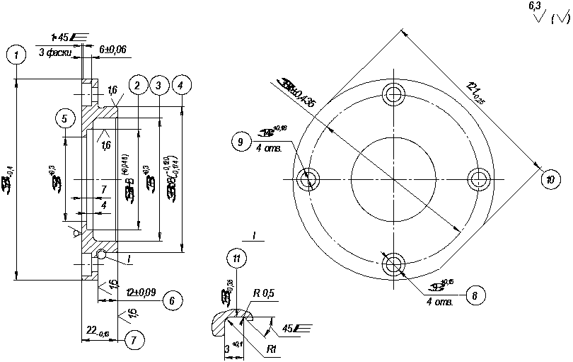 Разработка технологического процесса механической Намечая технический маршрут обработки детали, следует придерживается следующих правил: 1. С целью экономии труда и времени технологической подготовки производства использовать типовые процессы обработки деталей и ее элементарных поверхностей. 2. Не проектировать обработку на уникальных станках. 3. Применение уникальных и дорогостоящих станков должно быть технологически и экономически оправдано. 4. Использовать по возможности только стандартный режущий и измерительный инструмент. 5. Стремиться применять наиболее совершенные формы организации производства, непрерывные и групповые схемы обработки, групповые технологические процессы и групповые наладки на отдельные станки; 6. Рационально выбирать количество поверхностей, обрабатываемых на одной установке (позиции). При проектировании маршрутного технологического процесса рекомендуется на эскизе детали пронумеровать все поверхности (рис. 1) и разработать маршруты обработки для каждой элементарной поверхности. Результаты проектирования целесообразно представить в виде таблицы (пример табл. 1) Нормы точности обработки поверхностей приведены в [4].