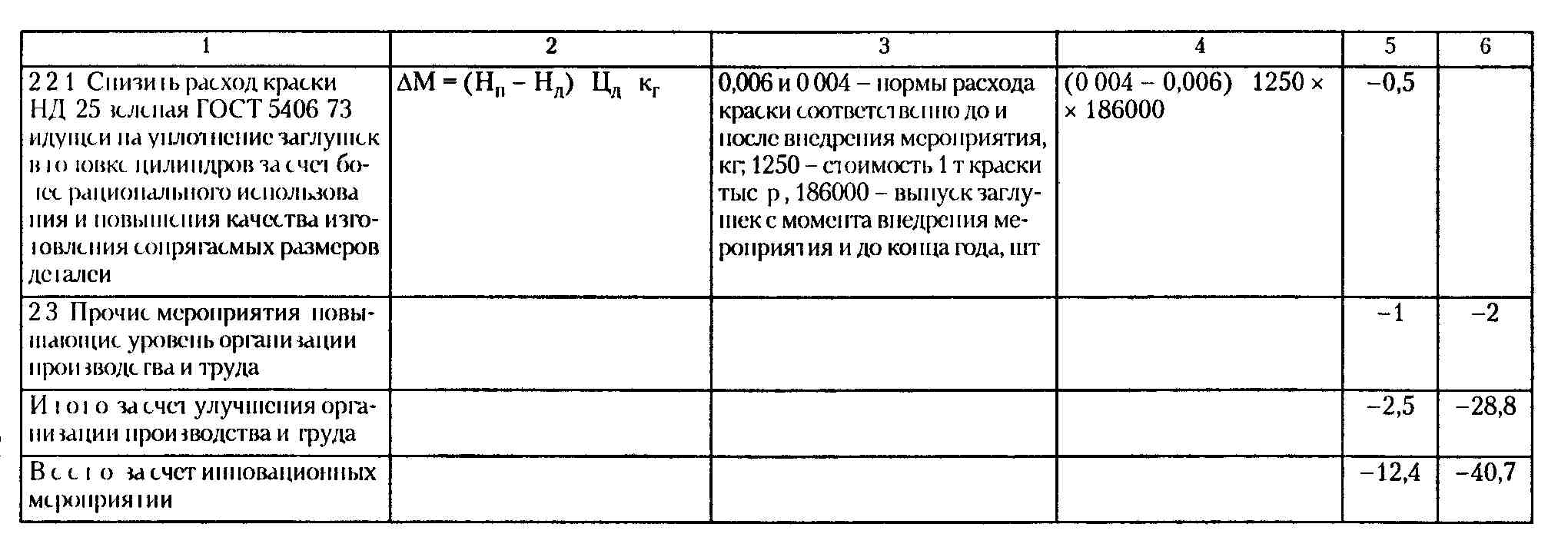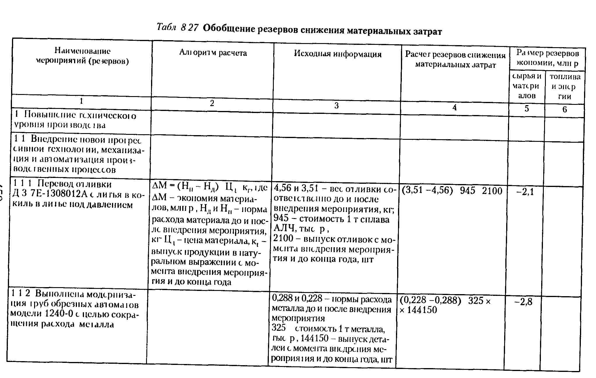 лов и материальных затрат, не использованные в отчетном году. Изучение конкретных условий производственно-хозяйственной деятельности анализируемого предприятия позволяет сделать выводы о том, что такие возможности на предприятии есть. В частности, имеются все условия для внедрения в производственный процесс комплекса организационно-техни-че-ских мероприятий и мероприятий по новой технике, позволяющих обеспечить сокращение норм расхода сырья, материалов, топлива, энергии и в конечном счете экономию материальных ресурсов. В табл. 8.27 приведены алгоритмы и обобщены результаты расчетов, искомых резервов. Перечисленные в этой таблице мероприятия отражают лишь потенциальные возможности экономии материалов. Реальным же резервом экономии является практическая реализация намеченных мероприятий. Так, проведение указанных инновационных мероприятий обусловит экономию сырья и материалов на 12,4 млн р., топлива и энергии - на 40,7 млн р. Общий резерв экономии материальных ресурсов на предприятии составляет 57,1 млн р. (12,4+ 40,7). Выявленные потенциальные возможности экономии материальных ресурсов должны быть учтены при разработке планов оргтехмероприятий и внедрения новой техники, а также при планировании соответствующих показателей на предстоящий год.