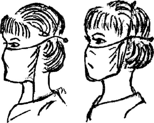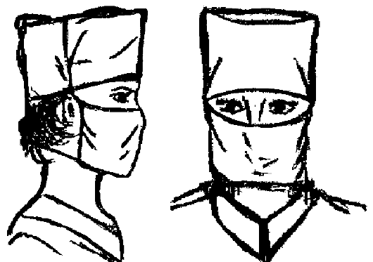 5. Нижние концы маски завяжите на темени (см. рис. 1.6). 6. Наденьте медицинскую шапочку так, чтобы она полностью прикрывала волосы (рис. 1.7). Маску можно надевать, завязывая концы поверх шапочки (рис. 1.8). Маска должна закрывать лицо от нижних век до подбородка. 7. При посещении оперблока наденьте бахилы (хлопчатобумажные сапожки) поочерёдно на правую и левую ноги на сменную обувь и зафиксируйте их завязками в нижней трети голени (рис. 1.9).
