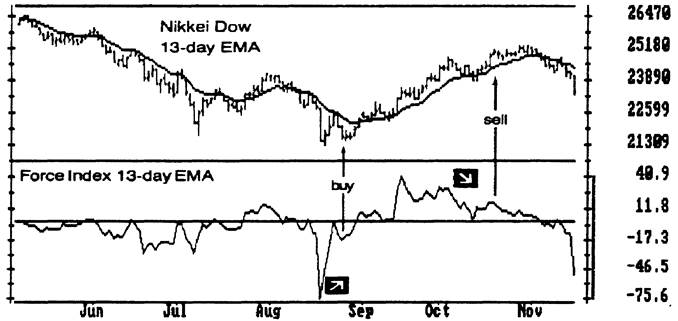 Рис. 52. Индекс силы, 13-дневное ЕМА Дивергенция между 13-дневным ЕМА от индекса силы и ценами определяют основные повороты рынка. Дивергенция "быков" между 13-дневным ЕМА от индекса силы и индексом Nikkei в августе показывало на возможность для покупки. Nikkei опустился до прежнего минимума, а индекс силы дал немного менее глубокий второй спад, давая сигнал покупать. Резкий провал индекса силы, такой, как в августе, дает игроку два сигнала. В долгосрочном плане это обычно указывает на окончание масштабного спада. В краткосрочном плане это говорит о том, что последний минимум цен будет, вероятно, достигнут еще раз или превзойден. Индекс Nikkei полз вверх в октябре, но индекс силы давал понижающиеся максимумы. Эта дивергенция "медведей" указывала на то, что "быки" слабели и цены приближались к вершине. Было много времени для начала игры на понижение. Резкий провал на правом краю графика говорит о том, что последний минимум цен, вероятно, будет достигнут еще раз или превзойден. Двухдневное ЕМА от индекса силы хорошо вписывается в игровую Систему Трех Экранов (см. главу 9.1). Его способность точно показывать момент для покупки и продажи особенно полезна, когда ее объединяют с долгосрочным индикатором указателя тренда.