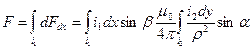 где β — угол между вектором магнитной индукции В = μo H dx и вектором тока i 1; μo – магнитная проницаемость воздуха. Полную силу F взаимодействия между проводниками 1 и 2 получим после интегрирования dFdx по всей длине проводника 1: