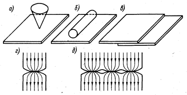 Электрические аппараты состоят из отдельных деталей и проводников, электрически соединенных между собой. Место перехода тока из одной токоведущей детали в другую называют электрическим контактом (контакт). Деталь, осуществляющую контакт, называют контактом-деталью. Наличие электрического контакта (само явление) называют контактированием. Из самого определения «электрический контакт» следует, что контакт, по крайней мере, состоит из двух частей. По возможному перемещению этих частей относительно друг друга при заданном действии устройства контакты электрических цепей могут быть разделены на три группы: разборные, коммутирующие и скользящие. Разборные контакты – это те, у которых в процессе работы детали не перемещаются относительно друг друга, а остаются надежно скрепленными. Например, болтовое соединение шин, присоединение проводников к зажимам и т.д. Коммутирующие контакты – это те, которые в процессе работы замыкают, размыкают или переключают цепь, в которой течет или может протекать ток. Например, контакты выключателей, контакторов, рубильников и т.п. Скользящие контакты – разновидность коммутирующих контактов, у которых одна из деталей перемещается (скользит) относительно другой, но электрический контакт при этом не нарушается. Например, контакты реостатов, щеточный контакт электрических коллекторных машин, шарнирный контакт. Говоря об электрическом контакте, следует различать условную и эффективную площади контактирования. Как бы тщательно ни были отшлифованы контактные поверхности, они все же будут иметь микроскопические бугорки и шероховатости. Поэтому физически две поверхности будут контактировать не всей условной площадью рабочей поверхности контакта-детали (рис. 4-1, в), а лишь отдельными микроскопическими площадками (рис. 4-1, д). Число площадок контактирования и их расположение зависят от геометрических форм контактирующих деталей. По форме контактирования различают три типа контактов: точечный, линейный, поверхностный. Точечный – контактирование обеспечено только в одной площадке – точке (рис. 4-1, а и г). Например, сфера – сфера, сфера – плоскость, конус – плоскость и х. д. Здесь условная и физическая картины контактирования совпадают. Линейный – условное контактирование деталей происходит по линии (рис. 4-1, б и д). Например, цилиндр – цилиндр (по образующей), цилиндр – плоскость, виток – виток и т.д. Физическая картина контактирования будет представлена рядом площадок (минимум две), расположенными на линии. Поверхностный – условное контактирование происходит по поверхности (рис. 4-1, в), физическое – в ряде площадок (минимум три), расположенных на этой поверхности.