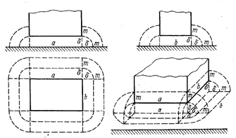 Проводимость зазора подсчитывается как сумма проводимостей всех геометрических фигур, на которые разбито поле. Например, поле между четырехугольным полюсом и плоскостью (рис. 7-3) может быть представлено в виде суммы следующих простейших фигур: параллелепипеда сечением ab и высотой 8, четырех четвертей цилиндра радиусом δ и длиной образующих а и b, четырех четвертей полого цилиндра толщиной m = (1 ÷ 2) δ, внутренним радиусом и длиной образующих a и b, четырех (на углах) половин шарового квадранта радиусом δ и четырех половин квадранта шаровой оболочки толщиной и внутренним радиусом δ. Для удобства расчета магнитную цепь заменяют эквивалентной электрической цепью, называемой схемой замещения. В схеме источник МДС изображается как батарея. Участки магнитопровода и воздушные зазоры изображаются в виде сопротивлений. Магнитное сопротивление на каждом из участков считают неизменным вдоль участка. Расчет ведется по законам Кирхгофа. При расчетах следует, однако, учесть, что аналогия с электрической цепью здесь формальная. В электрической цепи с линейными сопротивлениями зависимость I=f (U) прямолинейна. В магнитной цепи имеет место насыщение, и зависимость Ф = f (F) принимает нелинейный характер.
