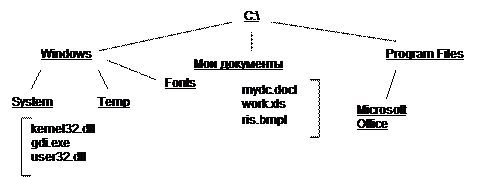 Файлы и каталоги Внешнее представление данных Любые данные, представленные в виде совокупности целых чисел, хранятся в памяти ЭВМ в виде файлов. Файл [file] – именованная целостная совокупность данных, причём не имеет значения, каких именно данных. Для файла данные – это лишь набор целых чисел в двоичной форме, поэтому файл – это просто последовательность байтов. Для пользователя имеют значение лишь два признака, которые характеризуют файл как таковой: имя файла и его размер. Размер файлов измеряется в байтах. Рис. 1.6 Дерево каталогов