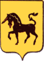 «В червлёном щите, золотой коронованный лев, держащий в правой лапе меч прямой, а в левой — меч выгнутый, на который опирается заднею правою лапою (лев), сопровождаемый восемью серебряными розами…»