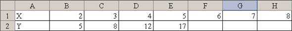 Запуск макроса с клавиатуры сочетанием клавиш Запись макроса, запускаемого из меню Сервис: 1 В меню Сервис выберите подменю Макроси выберите команду Начать запись. 2 Введите имя для макроса в соответствующее поле. Первым символом имени макроса должна быть буква. Остальные символы могут быть буквами, цифрами или знаками подчеркивания. В имени макроса не допускаются пробелы; в качестве разделителей слов следует использовать знаки подчеркивания. 3 Чтобы запустить макрос с клавиатуры с помощью сочетания клавиш, введите соответствующую букву в поле Сочетание клавиш. Для строчных букв используется сочетание CTRL+ буква, а для заглавных -CTRL+ SHIFT+ буква, где буква — любая буквенная клавиша на клавиа- туре. Она не может быть цифрой или специальным символом. Заданное сочетание клавиш будет заменять любое установленное по умолчанию в Microsoft Excel, пока книга, содержащая данный макрос, открыта. 4 В поле Сохранить в книге выберите книгу, в которой должен быть сохранен макрос. Чтобы макрос был доступен независимо от того, используется ли в данный момент Microsoft Excel, его следует сохранить в личной книге в папке XLStart. Чтобы сделать краткое описание макроса, введите необходимый текст в поле Описание. 5 Нажмите кнопку OK. По умолчанию, при записи макроса используются абсолютные ссылки. Макрос, записанный с абсолютными ссылками, при выполнении всегда обрабатывает те же ячейки, которые обрабатывались при его записи. Для того, чтобы с помощью макроса обрабатывать произвольные ячейки, следует записать его с относительными ссылками. Для этого нажмите кнопку Относительная ссылка на панели инструментов Остановка записи. Относительные ссылки будут использоваться до конца текущего сеанса работы в Microsoft Excel или до повторного нажатия кнопки Относительная ссылка. 6 Выполните макрокоманды, которые нужно записать в макрос. 7 Нажмите кнопку Остановить запись на соответствующей панели инструментов. Примечание. Чтобы макрос сначала выбирал определенную ячейку, выполнял макрокоманду, а затем выбирал другую ячейку, связанную с активной, нужно использовать и абсолютную, и относительную ссылки при записи макроса. При записи относительных ссылок кнопка Относительная ссылкадолжна быть нажата. При записи абсолютных ссылок кнопка Относительная ссылкане должна быть нажата. Пример 1 Разработать макрос для расчета прогнозируемых значений с помощью функции ТЕНДЕНЦИЯ. Зависимость y = f(x) задана таблицей (рис. 1):
