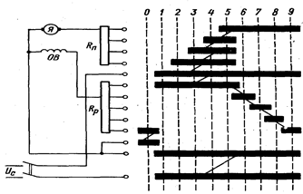 Контроллером называется аппарат, при помощи которого осуществляется ручное управление электродвигателями (пуск, регулирование частоты вращения, реверсирование, остановка). Контроллеры применяются для управления двигателями постоянного и переменного тока, в частности, подъемно-транспортных установок. Получение различных схем соединений двигателя с сетью напряжением U c, резистором пусковым R п, регулировочным R p и т. п. достигается поворотом рукоятки на определенный угол (рис. 17-8). Конструктивно контроллер представляет собой многоступенчатое контактное переключающее устройство, не связанное в одно целое с резистором. Отделение переключающего устройства от резистора вызвано либо большими габаритами последнего, либо условиями эксплуатации и размещением оборудования. Например, контроллер располагается в кабине оператора, а резистор выносится за пределы этой кабины.